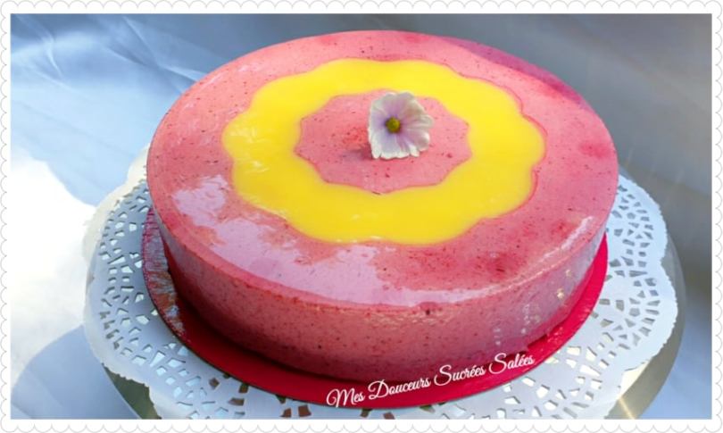 Cet entremet est composé d’une mousse fruits rouges, de 2 inserts au citron et d’un biscuit amande ![]()